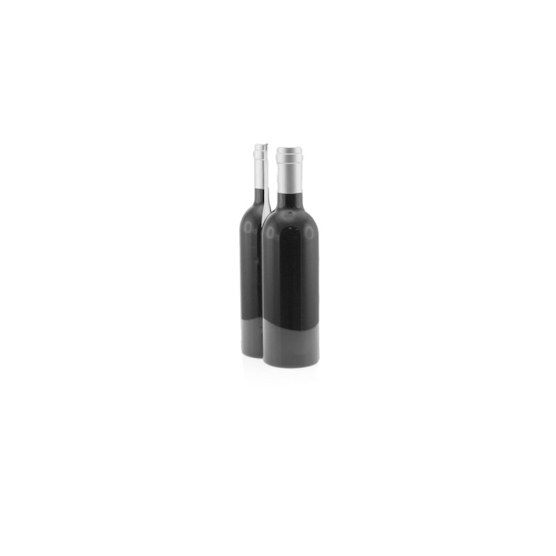 Original set de vin en forme de bouteille de vin au fini brillant, fermeture magnétique et accessoires en acier inoxydable. Il comprend un tire-bouchon avec un coupe-capsule et un ouvre-bouteille, un bouchon de dosage, un bac de récupération, un coupe-capsule et un bouchon. Présenté dans un etui individuel avec intérieur en mousse découpée.